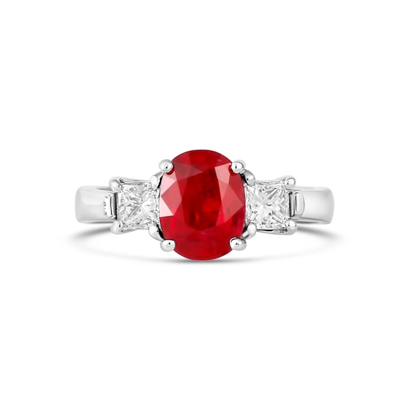 Ladies ruby and diamond ring in platinum. A 2.04 carat ruby is prong set into the ring. The ruby measures 8.53 x 8.36x 4.19 mm.