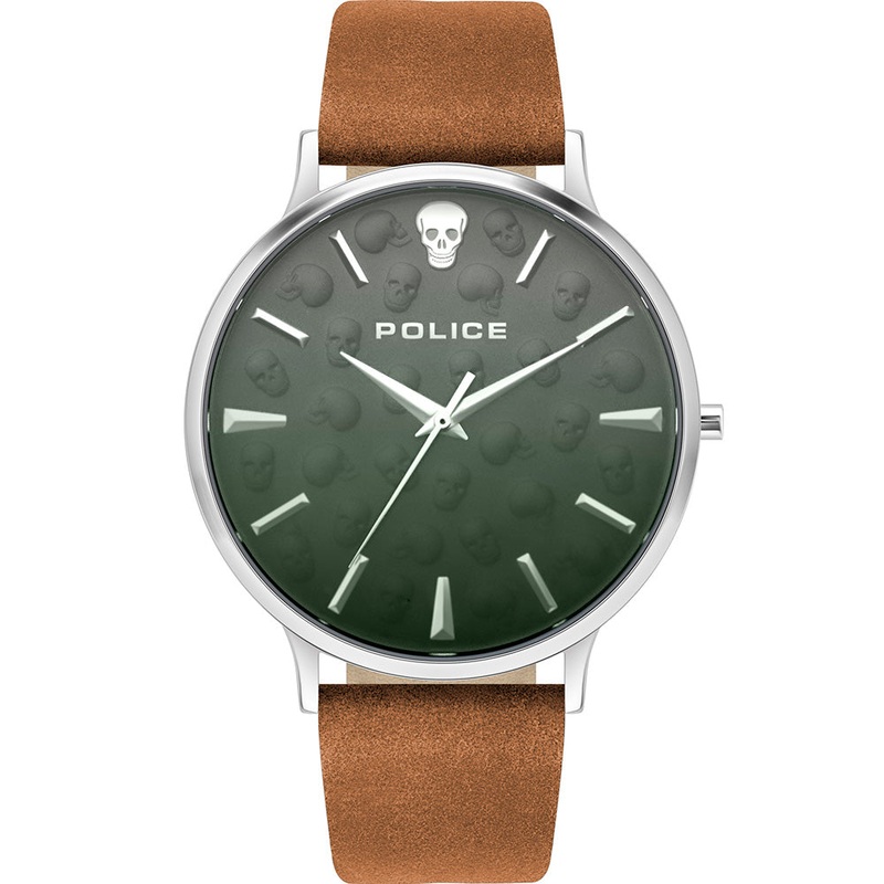Introducing the Police PL16023JS13 Tasman Mens Watch, featuring a striking green dial and a rich brown tanned leather band. This timepiece operates on Quartz Movement, housed within a durable stainless-steel case with a 42mm diameter. The elegant leather b