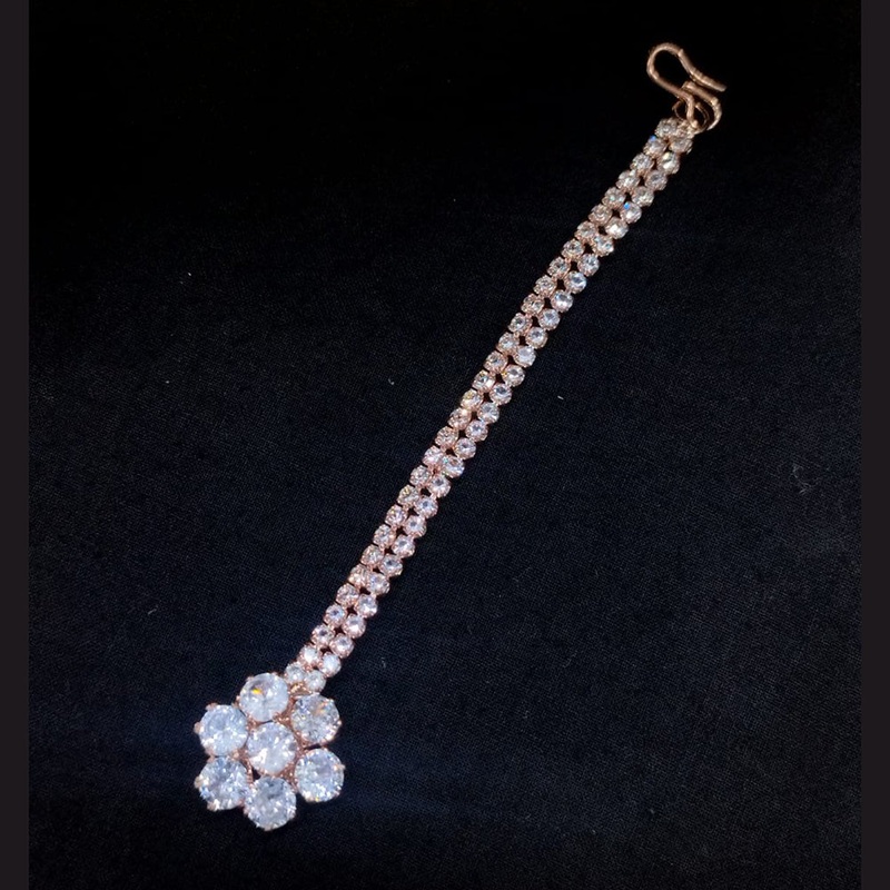 This Rose Gold Plated AD Maangtikka by Pooja Bangles is a stunning and intricately designed piece of jewelry. It features sparkling Austrian diamonds and a durable rose gold plating, making it a timeless and versatile accessory for any occasion. Elevate your style and make a statement with this exquisite Maangtikka. Note: Image may be vary slightly from the actual product.