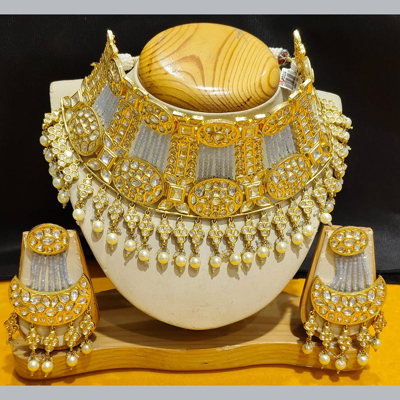 This Pooja Jewellers Gold Plated Polki Kundan Stone And Beads Choker Necklace Set boasts an impressive combination of gold plating, kundan, and beads. Crafted with precision, it adds sophistication and elegance to any outfit. The set provides both style and versatility, making it a must-have for any jewelry collection. Note: Image may be vary slightly from the actual product