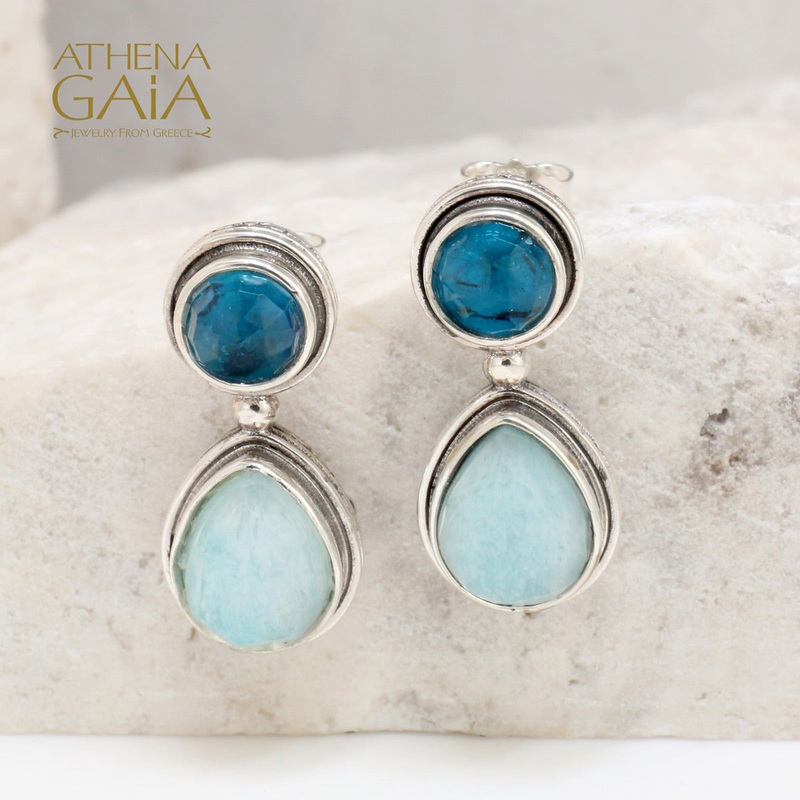 The first photo shows Apatite top stones, Amazonite bottom stones.Photo with 3 pairs shows: all Apatite on left, all Lapis on top, and all Mother of Pearl on right. Model photo shows: Lapis on top and Turquoise on the bottom. Fourth photo shows: all Apatite. Fifth photo shows: Apatite and Amazonite, next to all Malachite. Pictured on white background: Ruby top with Turquoise Copper bottom.