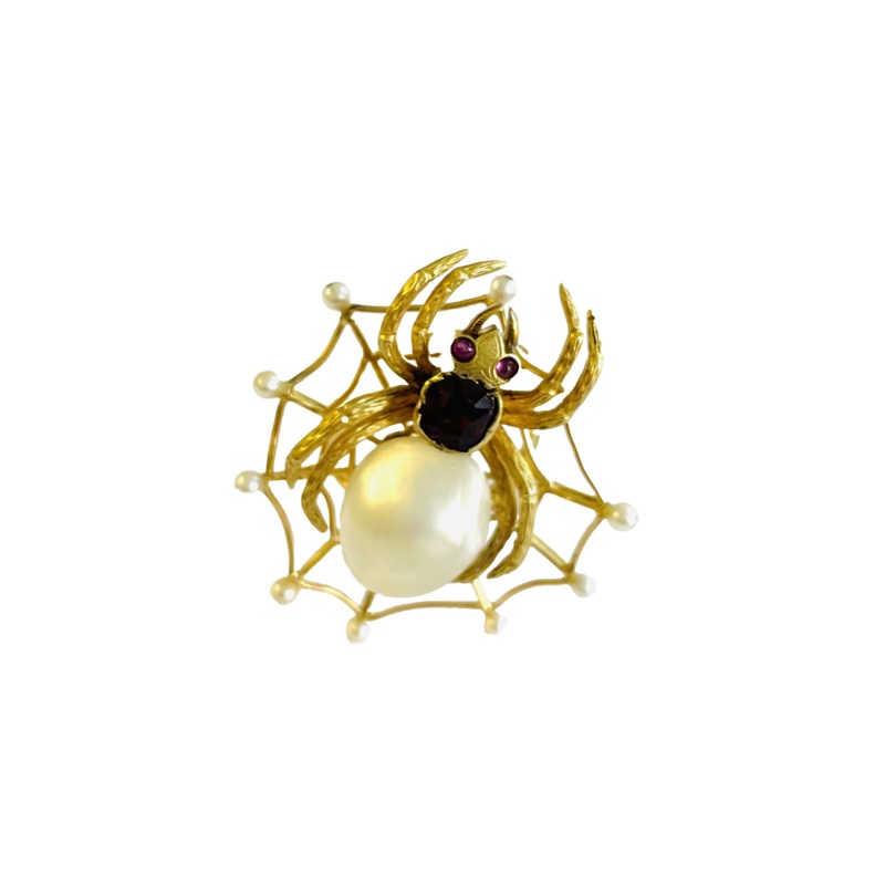This ring is a unique blend of old and new, featuring an 18kt yellow gold band newly manufactured with a vintage spider motif from around 1910. The spider displays a garnet chest and ruby eyes, along with a natural baroque pearl belly. Weighing 12 grams, this size 8.5 ring measures approximately 3 x 3.6 cm for an eye-catching statement piece that combines history with modern craftsmanship.