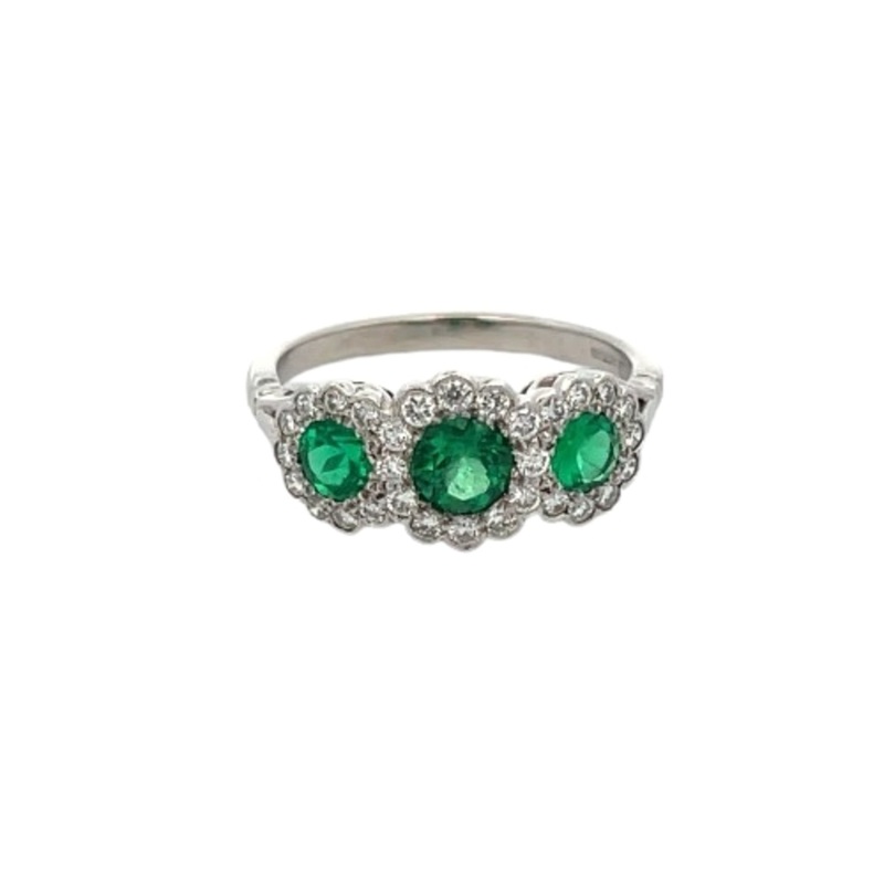 This vintage platinum ring from England features three emeralds encased in a halo of thirty brilliant-cut diamonds, totaling approximately 0.30 carats. The piece carries English hallmarks and weighs 3.80 grams. It is a size 5.25 but can be resized to fit p