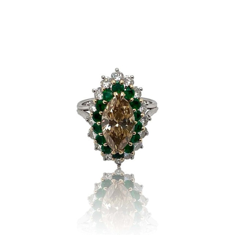 This ring is a vintage piece from the post-1980s design period. It features a 1.74-carat VS2 fancy brown yellow diamond (GIA report included), complemented by approximately 1.20 carats of additional diamonds and about 0.60 carats of emeralds. The ring size is 5.75 (US) and it’s crafted in platinum, making it an exquisite addition to any jewelry collection.