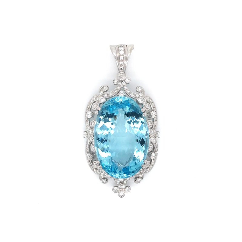 This pendant features a striking oval aquamarine at its center, weighing 51.92 carats and showcasing a greenish-blue hue (GIA report included). It is complemented by 109 round diamonds totaling about 3.50 carats, with F-G color and VVS-VS clarity, all set