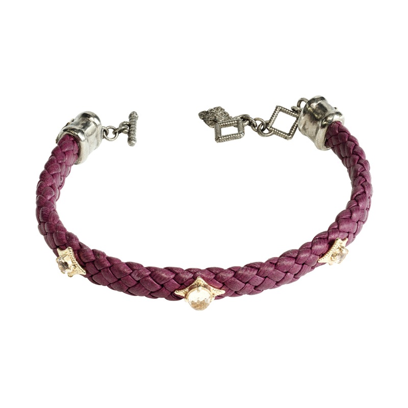 Bracelet 14k Rose Gold, Blackened Sterling Silver and Brown Woven Leather with Stars and Round Brilliant Morganite Peach