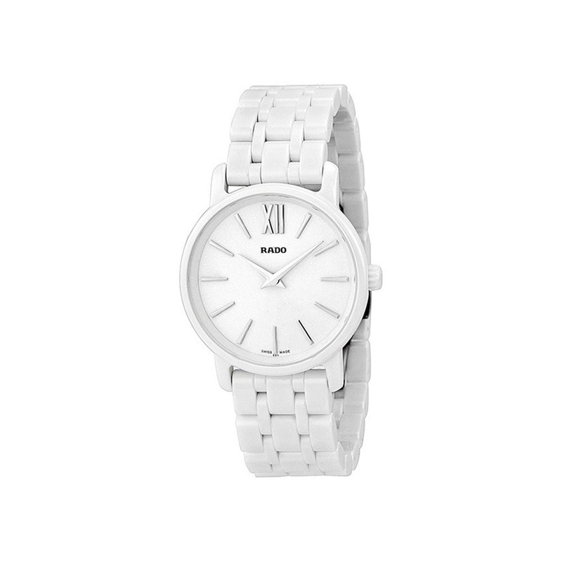 The Rado DiaMaster Roman Mini Ceramic Womens Watch Model # R14065017 has an analog dial and Quartz movement for reliable timekeeping. It is powered by Rado Calibre 218 engine and has a solid case back that ensures safety of the valuable watch assembly. The crown has push/pull functionality and can be used for adjusting time settings. The watch features scratch-resistant sapphire crystal for enhancing the display. The bracelet of the watch is made from ceramic and features push button release functionality for tying it across the wrist. It is water-resistant up to 50 meters / 165 feet.