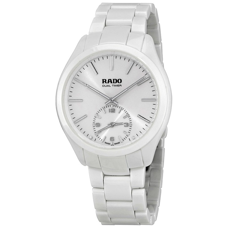 The Rado HyperChrome XL White Ceramic Quartz White Dual Timer Dial Mens Dress Watch Model# R32113102 has a unique and bold design that features a white case and bracelet strap made of hi-tech ceramic. The case holds the white sunburst effect dial that features silver-tone luminous hands and indices. This dual timer dial features a white sub-dial that has Arabic numeral hour markings at 3, 6, 9 and 12 o’clock positions. The watch comes with 50 meters of water-resistance capacity.