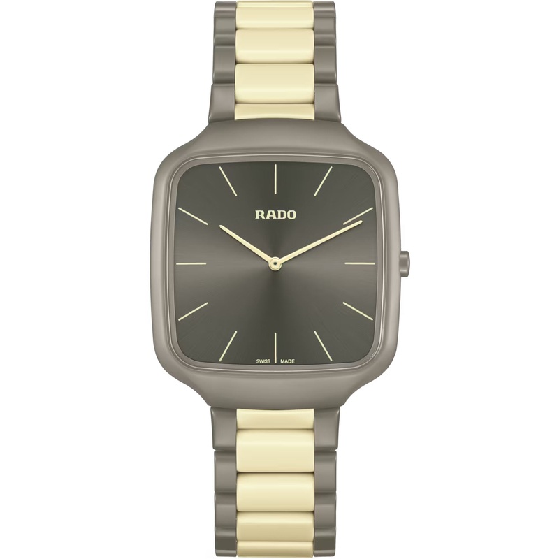 Rado Watch True Square Thinline X Les Couleurs Le Corbusier Limited Edition R27046172. Experience the harmonious blend of artistic expression and Swiss precision with the Rado True Square Thinline x Les Couleurs Le Corbusier watch. This exceptional timepiece pays homage to the iconic architectural colours of Le Corbusier. Powered by a reliable Quartz Rado calibre R420 movement, this watch ensures precise timekeeping with effortless elegance. The 37 mm case size strikes the perfect balance between style and wearability, making it suitable for any occasion. The matt grey brown natural umber high-tech ceramic case and crown exhibit a bold and contemporary aesthetic, embodying the essence of modern design. With its monobloc construction and flat sapphire crystal, this watch exudes durability and timeless elegance. The dial features a mesmerising sun brushed grey brown natural umber, while the cream white hands and indexes elegantly sweep across the dial, ensuring legibility and enhancing the watchs visual appeal. Crafted with precision, the matt grey brown natural umber and cream white high-tech ceramic bracelet complements the case, creating a seamless and cohesive look.