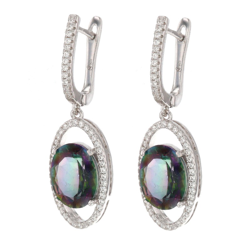 Sterling Silver Ladies Earrings Oval Rainbow Topaz 8.4 cts. Round Cubic Zirconia