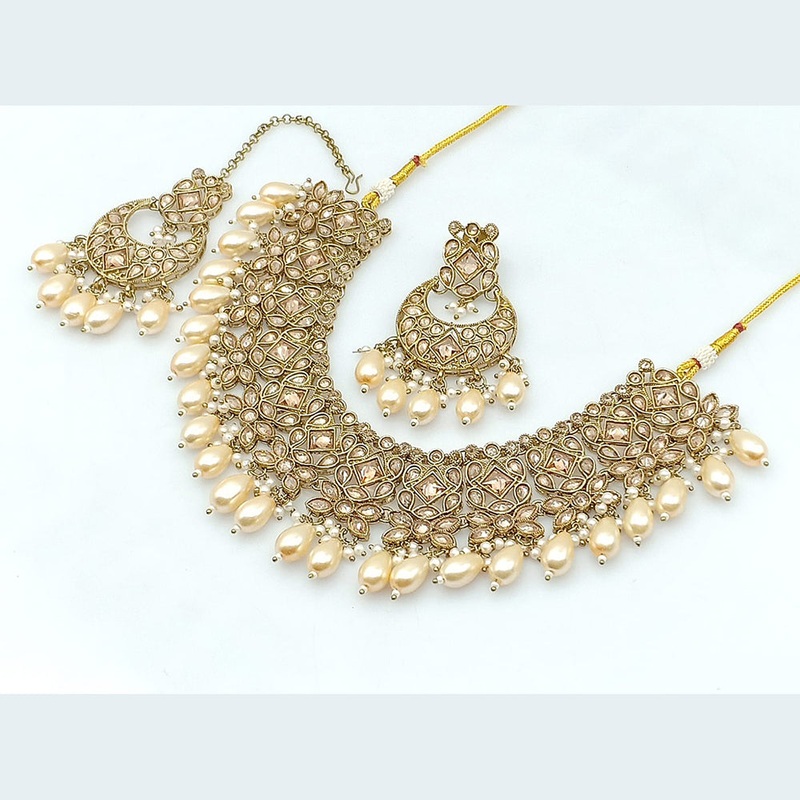Introducing the Rajwadi Collection Gold Plated Crystal Stone And Beads Necklace Set, a beautiful addition to any jewelry collection. Made with high quality silver plating, sparkling crystal stones, and delicate pearls, this set is perfect for special occas