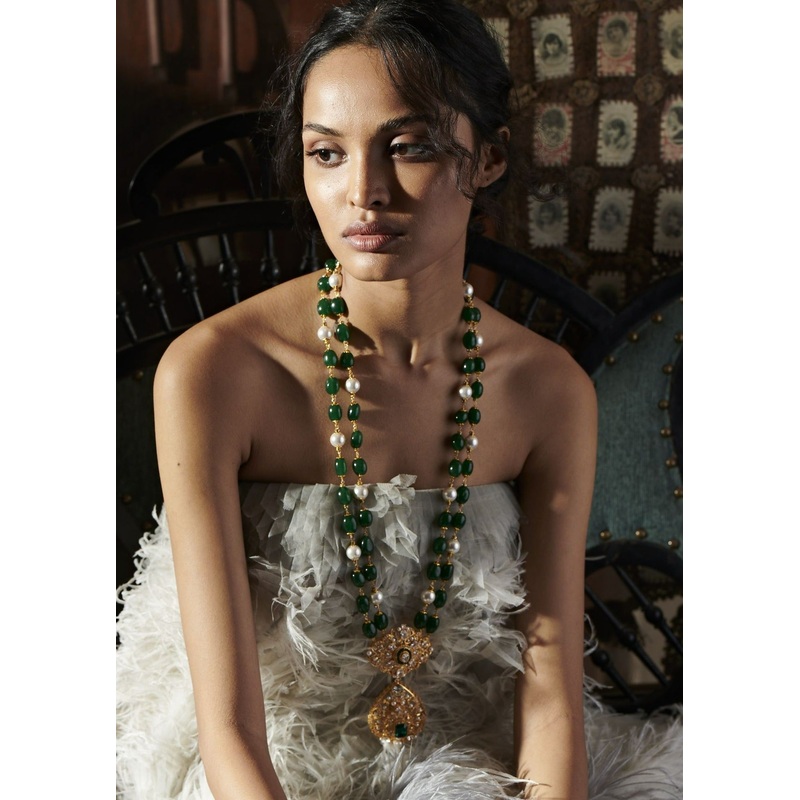 Crafted with lustrous freshwater pearls and green semi-precious stones strungtogether, with a gold plated pendant- the Ranjha necklace is sure to make you fall in love when paired with any festive outfit.