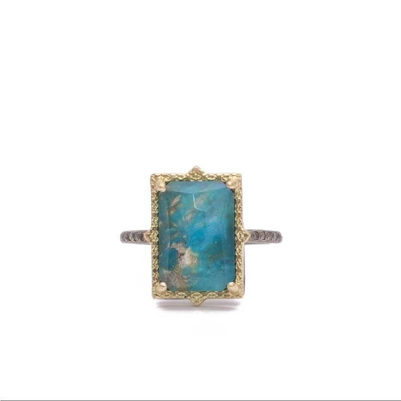 18K Yellow Gold and Sterling Silver 13x9MM Rectangular Peruvian Opal/White MOP/White Quartz Triplet Ring with Champagne Diamonds. (0.05 TCW)