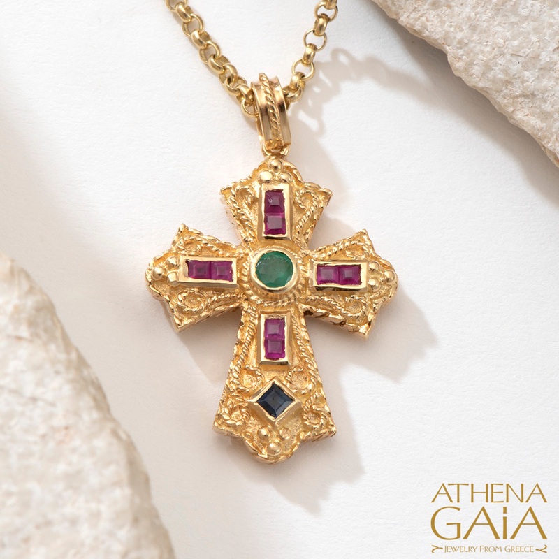 One side of the cross has Emeralds and a 0.08ct Diamond center. The other side has Rubies, an Emerald, and a blue Sapphire, all totaling approximately 1.10ct.