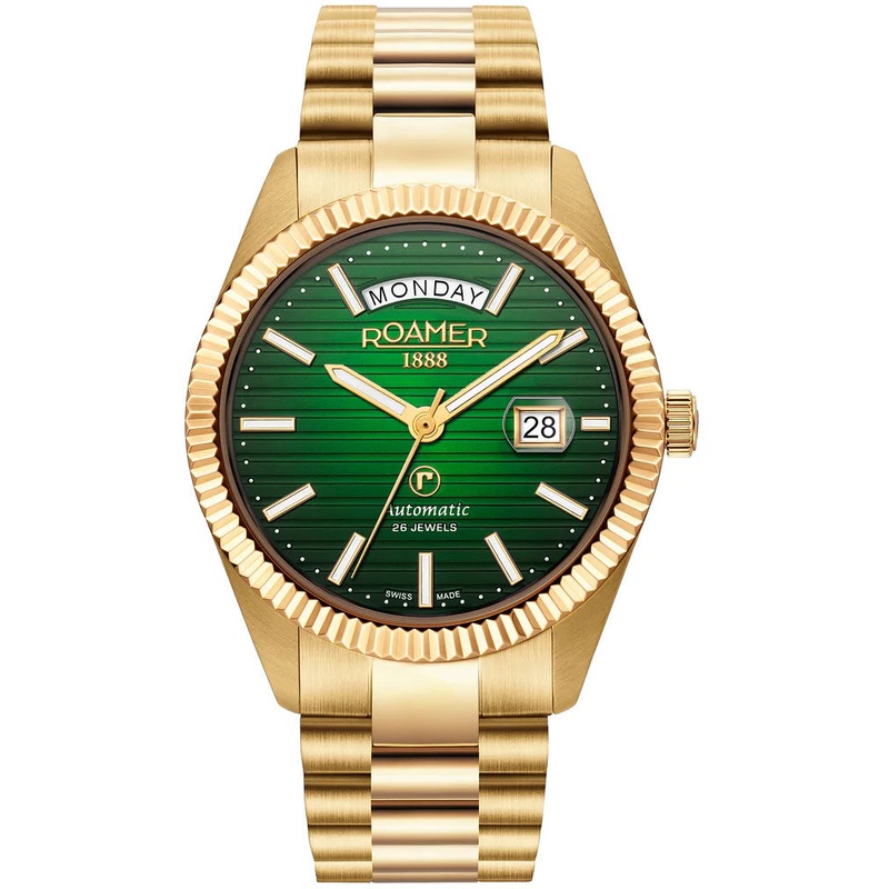 Roamer Swiss made, 7 year guarantee. Roamer Watch Primeline Daydate II Green 981666 48 75 50. Roamer oF Switzerland has been synonymous with high quality Swiss watches in combination with classically elegant designs since 1888. The brand steadily continues its success story with ongoing innovations, excellent materials, exquisite craftsmanship and precise Swiss movements. Perfect attention to detail and an exceptional & personal commitment makes ROAMERs timepieces truly unique.