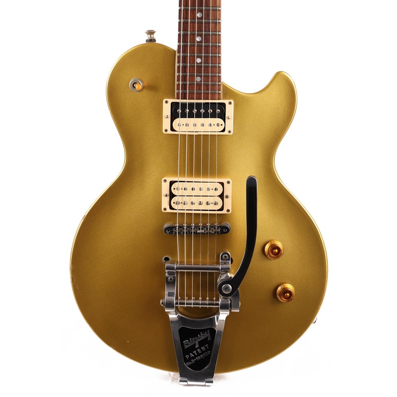 This is a used Robin Avalon model in very good playing condition. The single cutaway design features a mahogany body and neck with a bound rosewood fretboard, dot inlays, and master volume/tone controls. A previous owner installed a set of great sounding OX4 humbuckers and put on a Bigsby tailpiece. The original tailpiece and studs are included. There are lacquer chips on the headstock and edges of the body, some lacquer lifting under the tuners as well. The neck pickup mounting ring is cracked as shown. The original case is included.