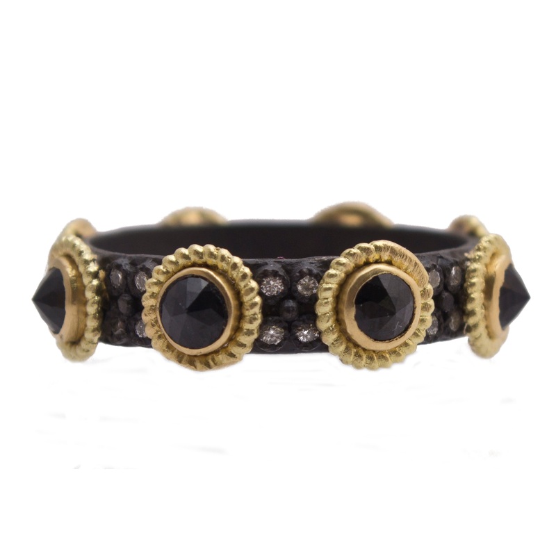 18K Yellow gold and sterling silver bezel with rose cut black Sapphires stack band with diamonds. (0.16 TCW)Dimensions:Band Width: 0.15" (4.03mm)Station Width:0.21" (5.43mm)