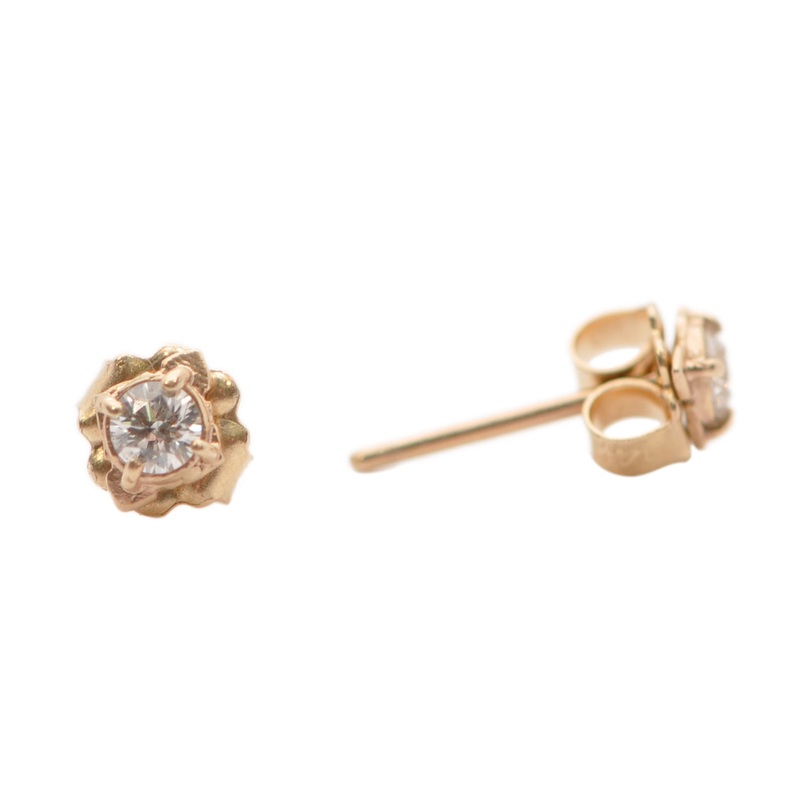 14k Rose Gold mini scroll stud earrings with 3mm 0.18TCW white diamonds. Measurements 5.7mmx4.5mm.