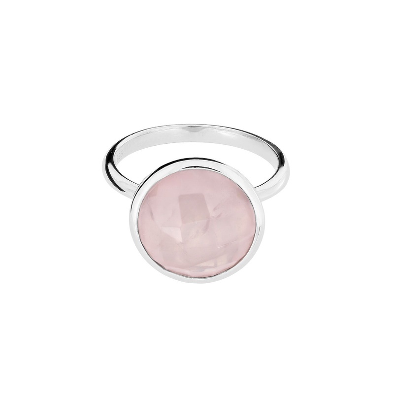 A stunning multi-faceted rose quartz stone sits encircled in a simple polished setting on a slim silver band. The open setting allows as much light as possible to enter the gem and show off its depth of colour.