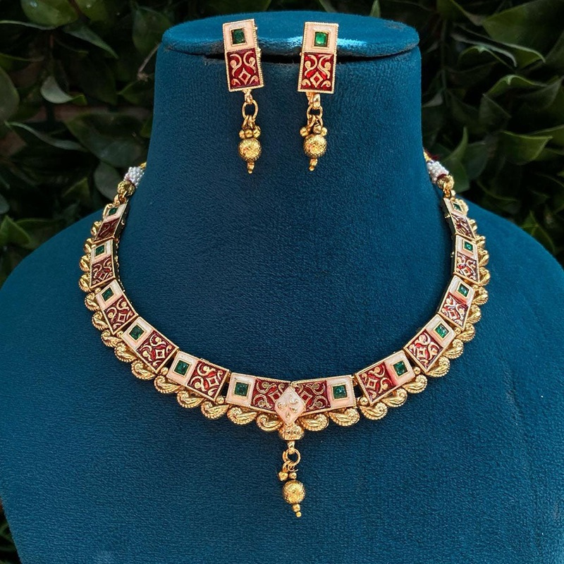 This Royal Kundan Jewellery Gold Plated Pota Stone and Meenakari Necklace Set is a stunning accessory that exudes elegance and traditional charm. The intricate Kundan work, coupled with the gold plated finish and vibrant Pota stones, adds a touch of sophistication to any outfit. Handcrafted with precision, this set is a must-have for any special occasion…….Note: Image may be vary slightly from the actual