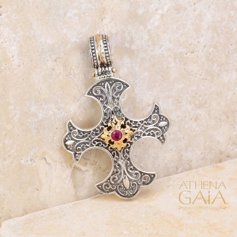 The Ruby Center Flared Western Cross is crafted with 18k gold and sterling silver. This exquisite piece features a stunning center stone and is perfect for baptisms, special events, or even daily wear.