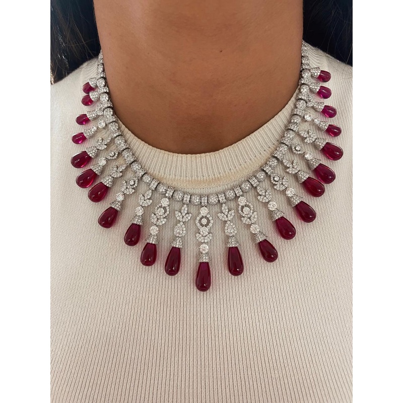 Ships fast to New York, London, Dubai, Riyadh, Kuwait City, and Doha. Shine bright with the exquisite Ruby Drops Leaflet Diamond Circular Necklace Setwhere bold design meets graceful beauty.