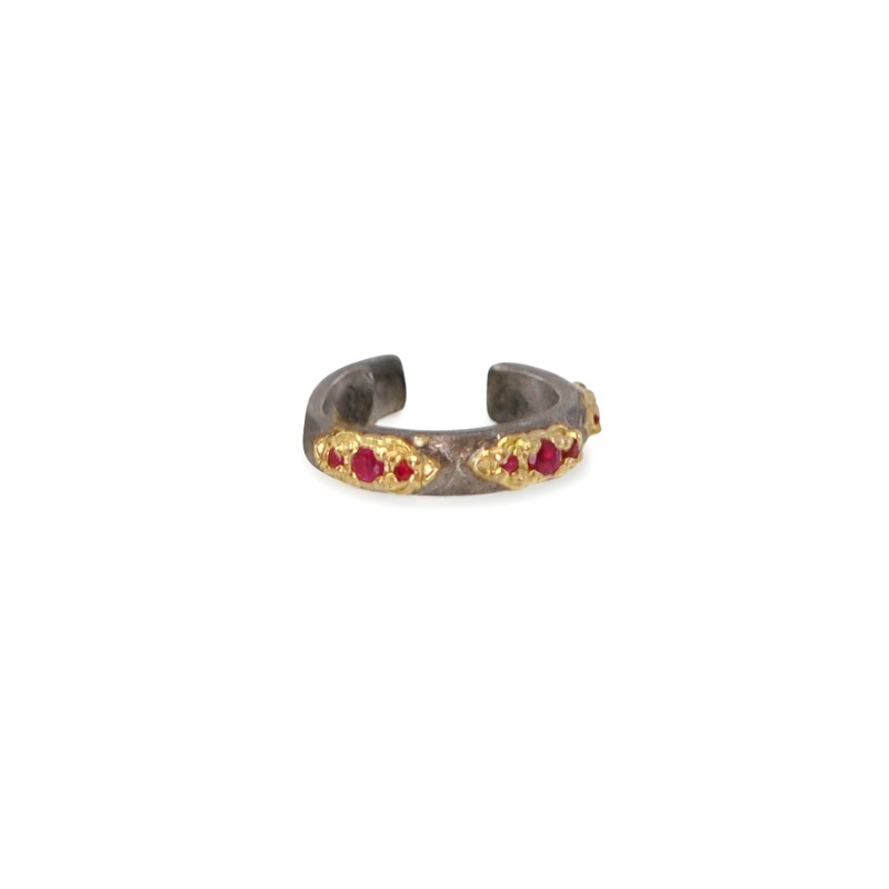 18k Yellow Gold and Blackened Sterling Silver ear cuff with scrolls featuring rubies