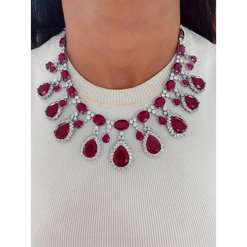 Make a dazzling statement with the Ruby Tear Drop Diamond Oval Necklace Set, featuring vibrant ruby-colored stones paired with sparkling zircon crystals in an elegant tear-drop and oval design. This necklace and matching earrings set is perfect for weddings, formal occasions, or gifting luxurious jewelry.