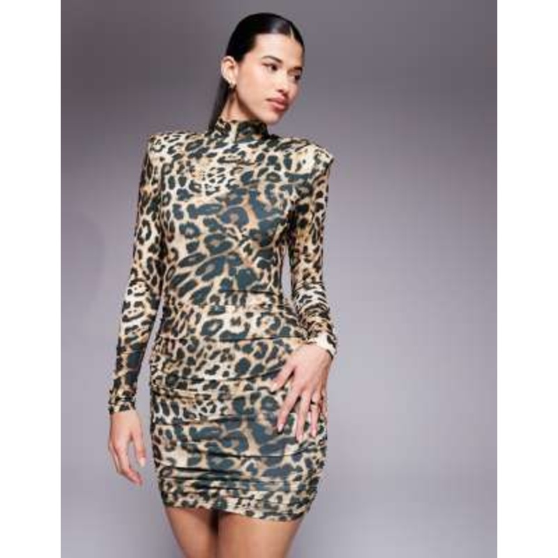 Find the best selection of Ruched & Ready Eyes On You removable shoulder pad detail high neck long sleeve sculpting mini dress in leopard print. Shop today with free delivery and returns (Ts&Cs apply) with ASOS!