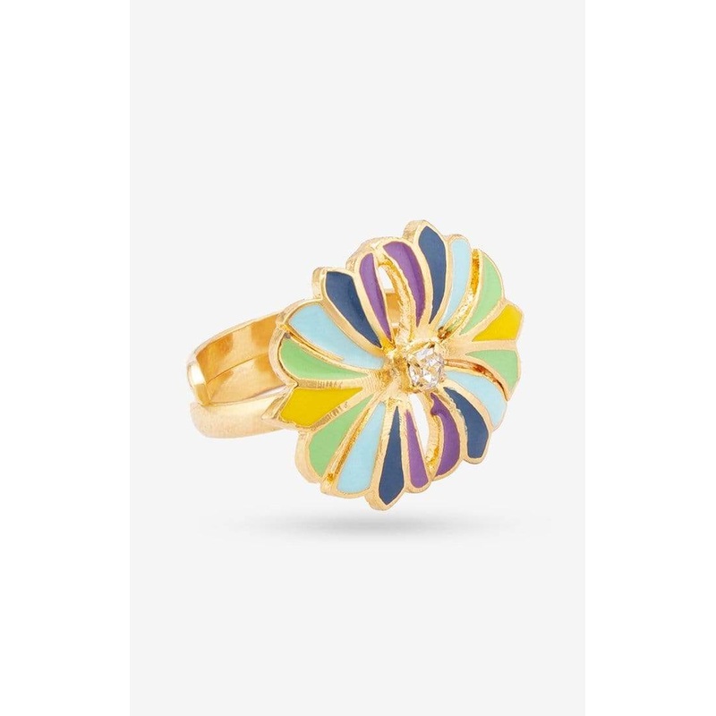 With an adjustable fit, the Saba Blue ring will fit all sizes and can also be styled as a midi ring. Polished in 24K gold tone, the floral inspired ring showcases carefully executed hand enameling and a sparkling center Swarovski stone.