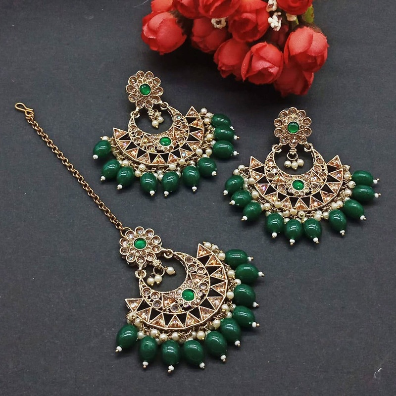 Elevate your style with Sai Fashion Gold Plated Crystal Stone dangler Earrings and Maangtikka Set. Crafted with intricate detail and adorned with sparkling crystals, these elegant earrings and maangtikka will add a touch of glamour to any outfit. Perfect for special occasions or to elevate your everyday look. Note: Image may be vary slightly from the actual product.