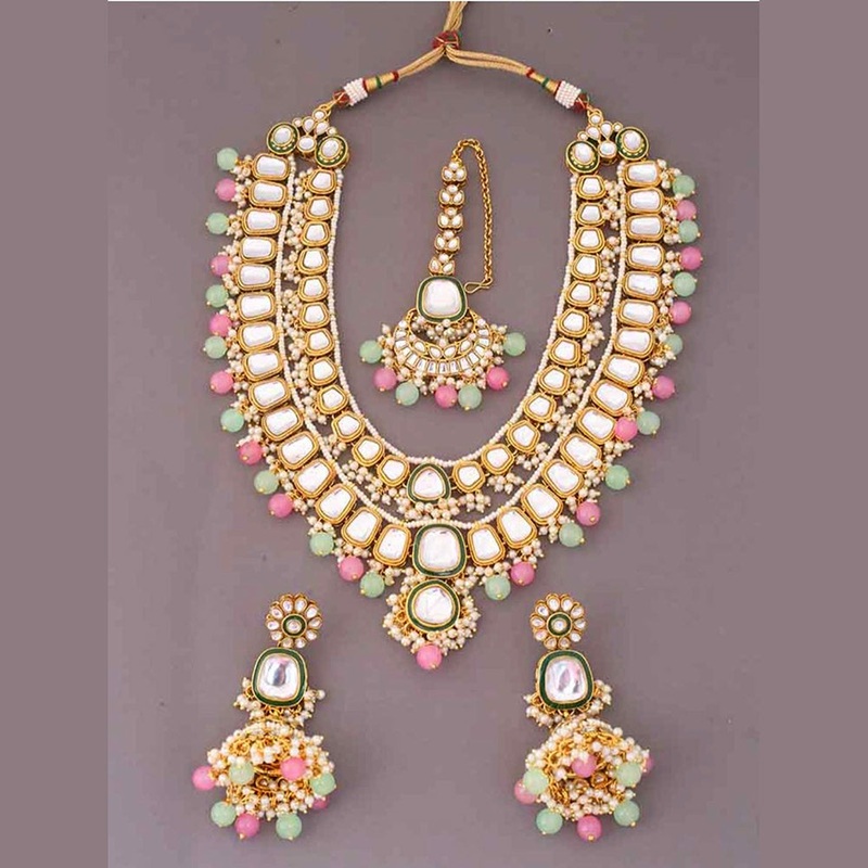 This Necklace set is crafted in Gold Plated and consists of a necklace and a pair of earrings. Style this necklace set with a saree or a salwar suit to enhance the look.This jewelry set is a great option and a perfect pick for your wedding functions. luxurious jewellery with high-end Be assured to find a variety of contemporary and traditional designs in the mesmerizing collection that we offer.