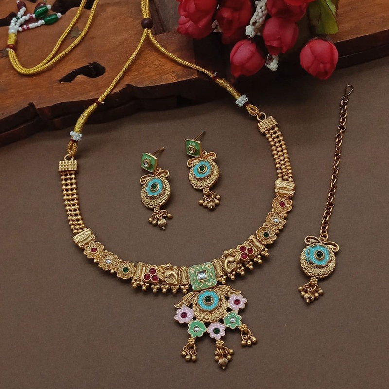 The Sai Fashion Gold Plated Pota Stone Necklace Set makes for a stunning addition to any jewelry collection. Adorned with intricately placed Pota stones, this necklace set is sure to turn heads with its glamorous, yet sophisticated look. Truly a timeless piece, this necklace set will surely make you stand out from the crowd.