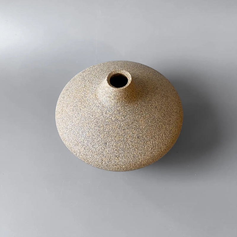 Wheel-thrown stoneware with glazed interior and raw ceramic exterior. Sandstone clay body has dark iron specks and ranges from sandy beige to warm brown.