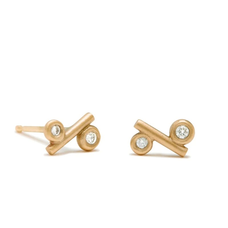These diamond stud earrings are both playful and modern. Two opposing diamonds of slightly different sizes, asymmetrically playing off each other. Handmade in 14k gold and CanadaMark diamonds Each 1/4″ wide.