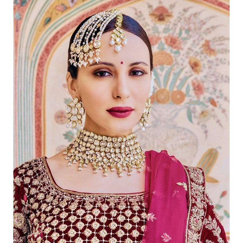 Sitting pretty on the head, our versatile Seher Passa designed with kundan and delicate pearls will surely make a statement when styled on your bridal lehenga.