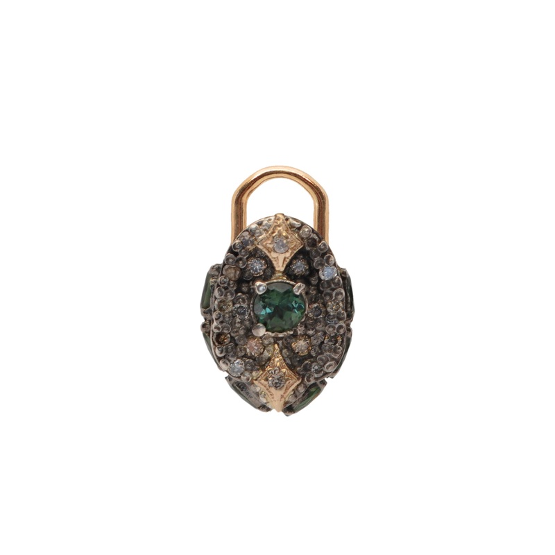 14k Rose Gold and Grey rhodium finish Sterling Silver shield charm lock with 3mm tourmaline, champagne pave diamonds, blue/green tourmaline marquise stones around the outside and crivellis. Shield Lock measures 18mmx9mm.