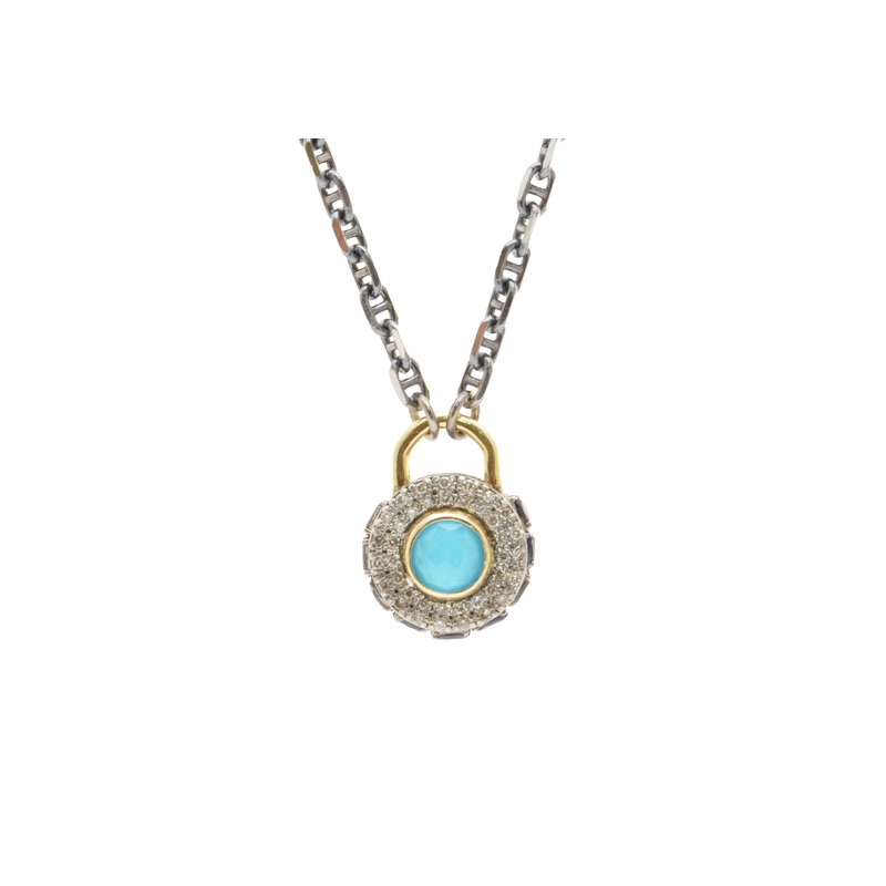 18K Yellow Gold and Grey Sterling Silver Pave Shield Necklace with 6MM Turquoise/White Quartz Doublet, Champagne Diamonds, Blue Sapphires. Adjustable at 16" and 18" (0.29 TCW)