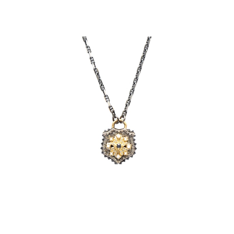 18K Yellow Gold and Grey Sterling Silver 23MM Shield Drop Necklace with White Freshwater, Cultured Pearls, Black Sapphires and Champagne Diamonds. Adjustable at 16", 17" and 18" (0.4 TCW)