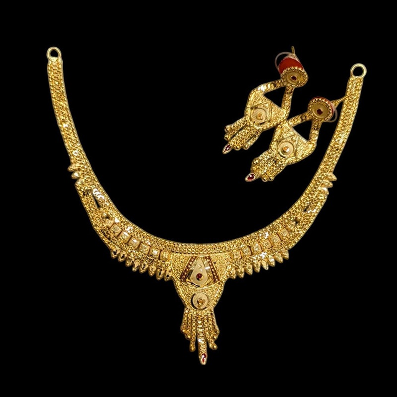 Crafted with precision and expertise, the Shipra Gold Forming Gold Necklace Set exudes elegance and sophistication. Made with high-quality gold and impeccable design, this set adds a touch of luxury to any outfit. Perfect for any occasion, make a statement with this timeless and stunning piece.Note: Image may be vary slightly from the actual product