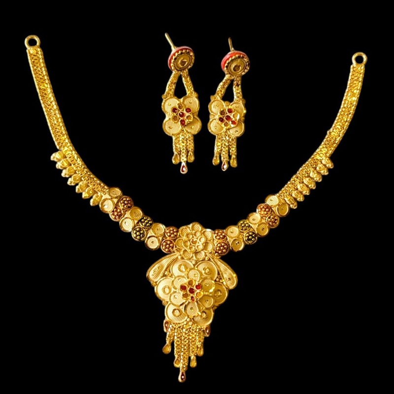 Crafted with precision and expertise, the Shipra Gold Forming Gold Necklace Set exudes elegance and sophistication. Made with high-quality gold and impeccable design, this set adds a touch of luxury to any outfit. Perfect for any occasion, make a statement with this timeless and stunning piece.Note: Image may be vary slightly from the actual product