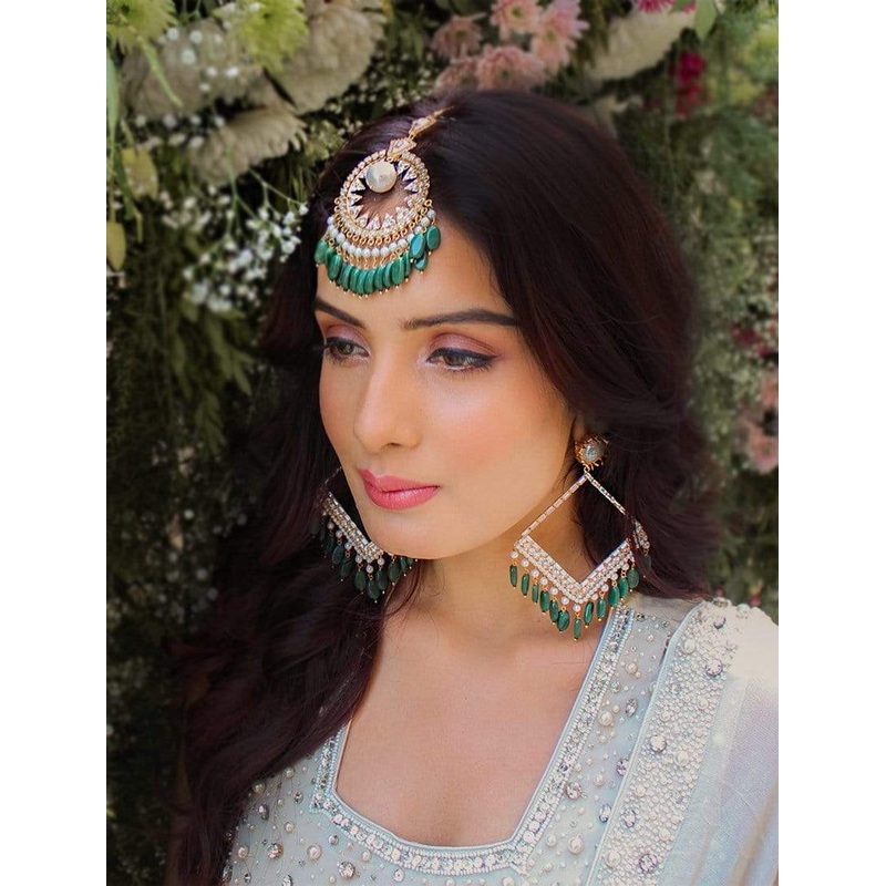 The set consists of Kite earrings andShooting Star Green maang tikka.