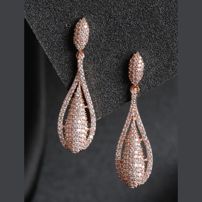 These elegant Sian Rose Gold Plated American Diamond Dangler Earrings are crafted with high-quality materials, giving them a timeless and sophisticated look. The rose gold plating provides durability and shine, while the American diamonds add a touch of sparkle. Perfect for any special occasion or everyday wear.