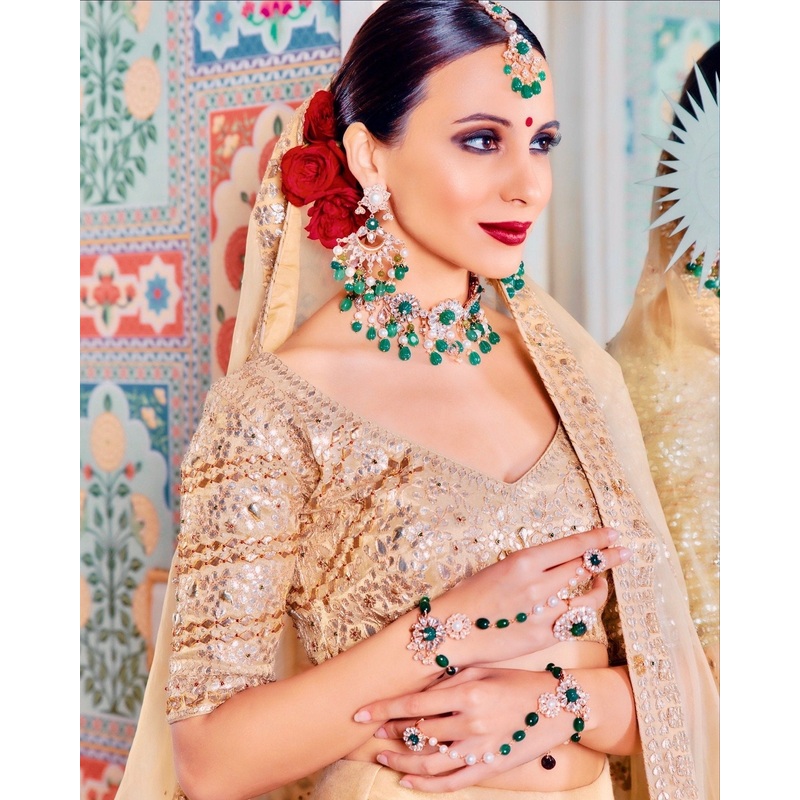 The set consists of the Sicily choker, Evi earrings , Sici hand harness, Evaine maangtikka and Dior ring.
