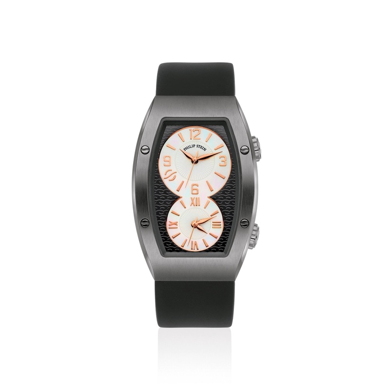 From our new Signature Evolution Collection, this sophisticated Philip Stein watch blends contemporary style with groundbreaking health and wellness technology. Dual time zone dials in striking beautiful Black rubber strap in deploymentbuckle the look and