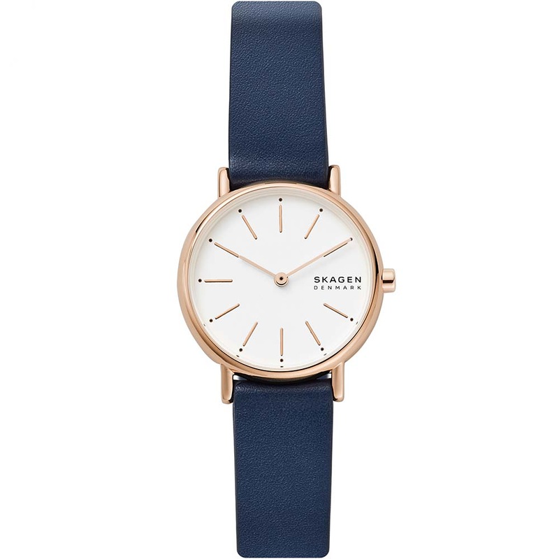 This Skagen SKW2838 Signature Blue Leather Womens Watch is set with a champagne gold tone case, with a simple but elegance white dial. With a round case and comfortable leather strap, this timepiece has a classic dress watch look. Pair it with bracelets or wear it alone for a stunning finish to your outfits.