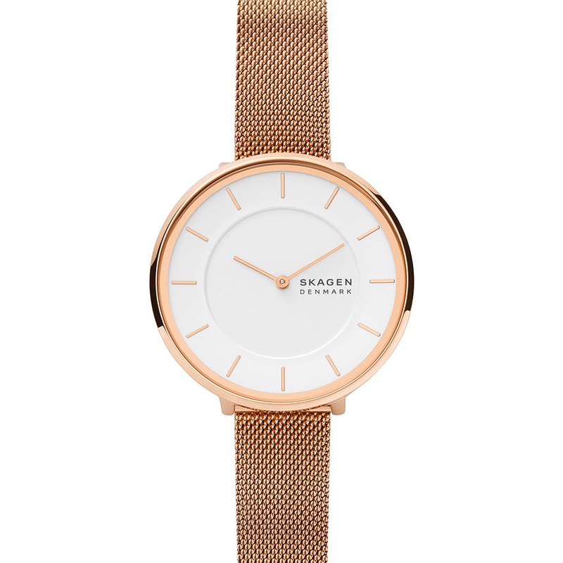 The Skagen SKW3013 Gitte exudes timeless sophistication with its rose gold-tone case and matching rose gold mesh band. The 38mm stainless steel case frames a pristine white dial, offering a classic yet modern look. Featuring a 14mm strap width and protected by a durable mineral crystal, this watch is powered by an SR621SW battery and provides 30 meters of water resistance, blending elegance with practical functionality.- 38mm Case Size – Stainless Steel Case and Mesh Band – 14mm Strap Width – Mineral Crystal – Battery Type SR621SW- 30 Meters Water Resistant