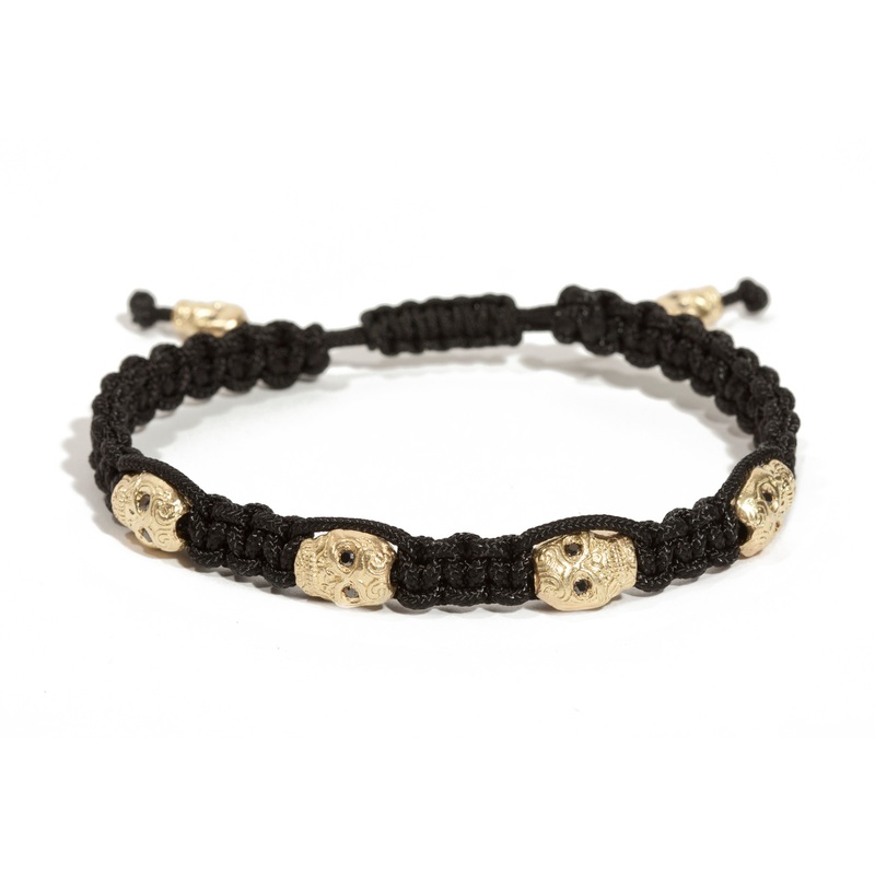 18K Yellow Gold Woven Pull Bracelet with 4 Skull Stations with Black Diamonds on Black Knotted Cord (0.12 TCW)