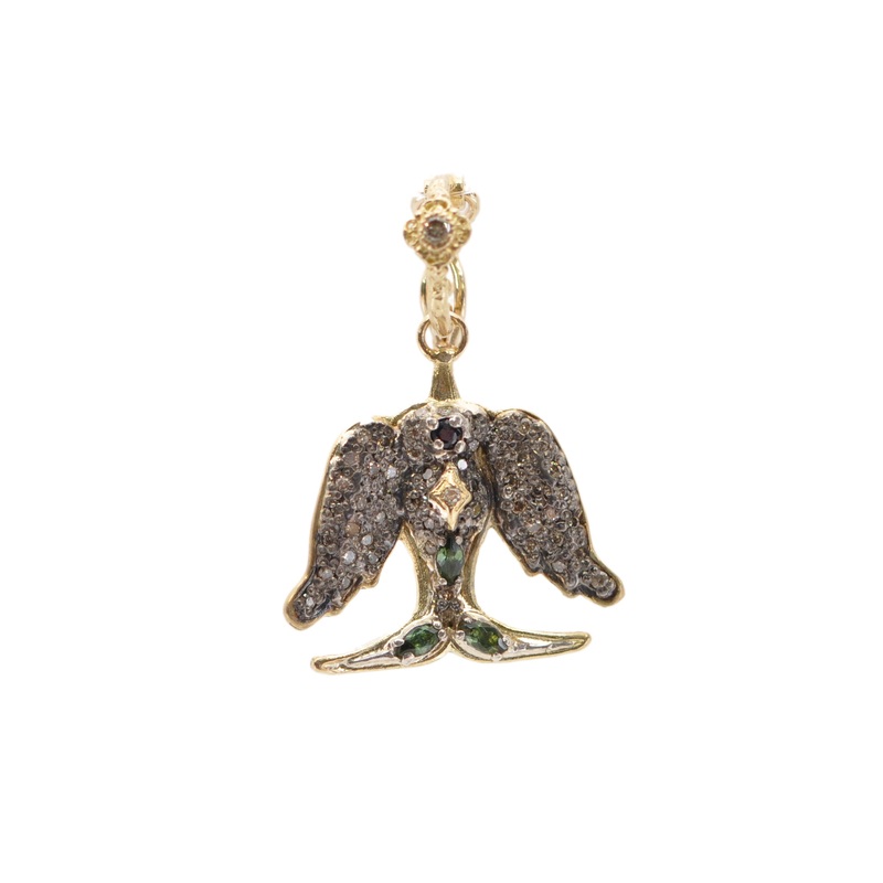 18k Yellow Gold and Blackened rhodium finish Sterling Silver gold bird shaped enhancer with blue/green marquise cut tourmaline, round blue sapphire, and 0.27TCW round champagne diamonds. Measures 21mmx19.5mm and 29mm with bail.