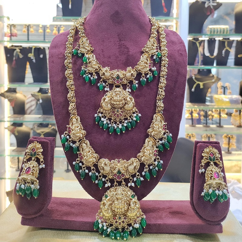 This exquisite SNERA Gold Plated Pota Stone And Beads Temple Double Necklace Set is the perfect addition to your jewelry collection. With intricate temple design and high-quality gold plating, this set exudes elegance and sophistication. The pota stone and bead detailing adds a touch of glamour, making it a versatile statement piece for any occasion. Note: Image may be vary slightly from the actual product